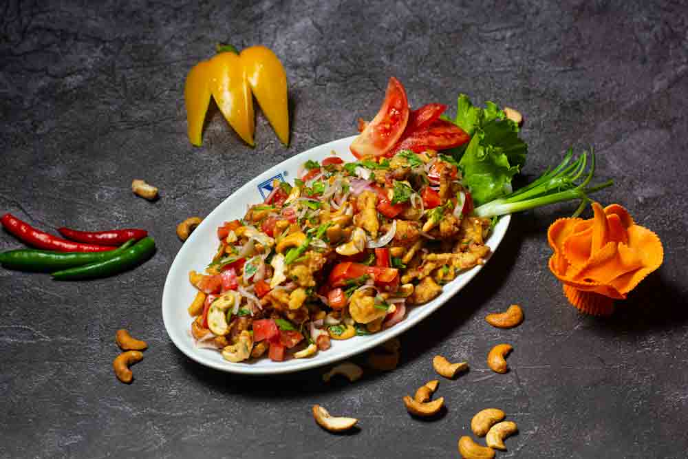 Spicy sliced chicken, roasted cashew nut, coriander, onion & tomato