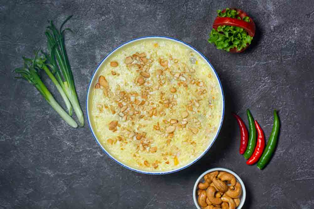 Sliced chicken, prawn,and mushroom cooked with low fat milk,Thai herbs...