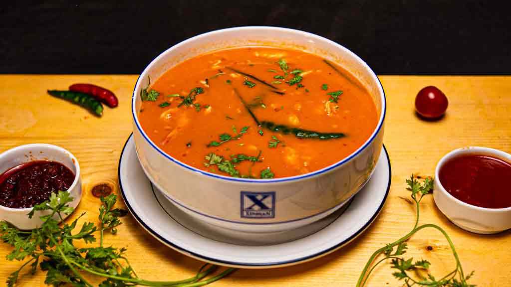 Sliced chicken, prawn, mushroom & ginger/ chili tomato puree for thick soup