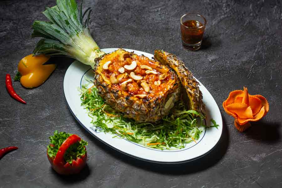 Shrimp cooked with cashew nut, carrot, butter & tomato sauce serve in pineapple.
