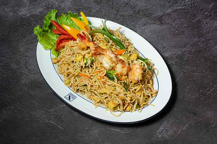 Pad Thai noodles cooked with mixed vegetable, ground nut, sliced chicken, prawn & egg