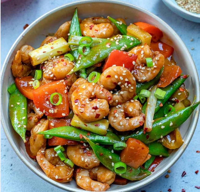 Prawn glazed in high heat and cooked with red chili, capsicum, carrot...