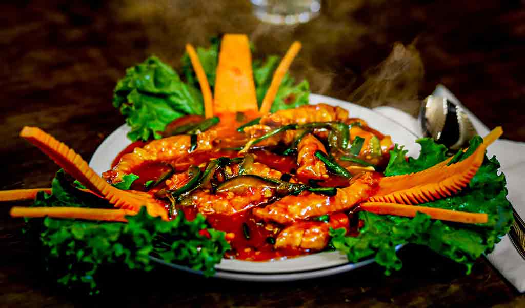 Crispy sliced beef prepared with Sze-Chuan hot & spicy chili sauce