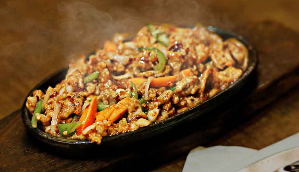 Sliced chicken glazed in high heat and cooked with red chili, capsicum...