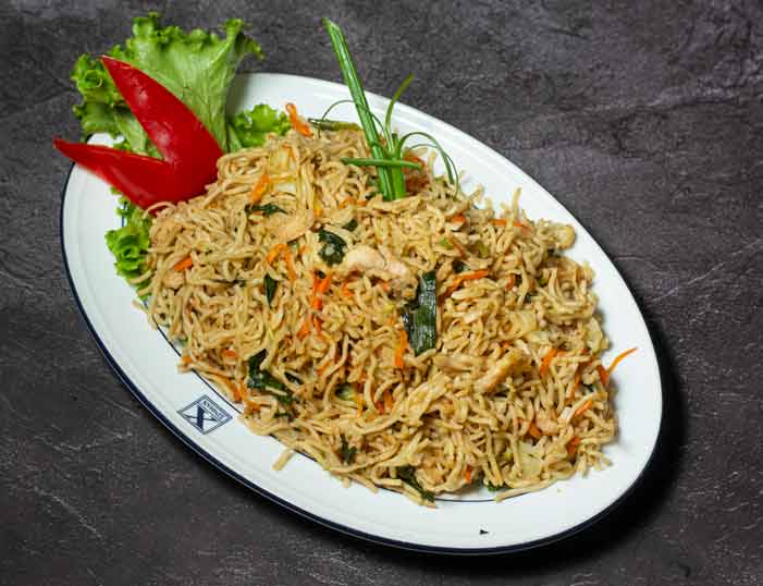 Stir fried noodles prepared with sliced chicken, prawn & mixed vegetab...