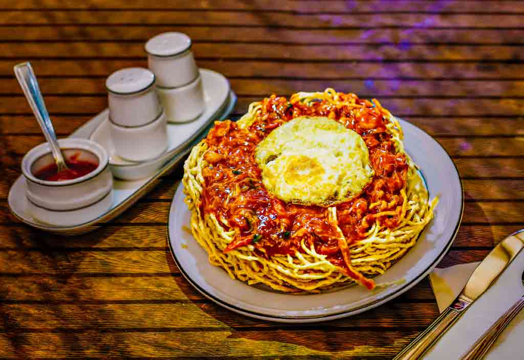 Crispy fried noodles topping with saucy sliced chicken & prawn